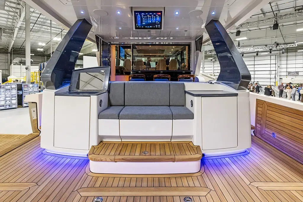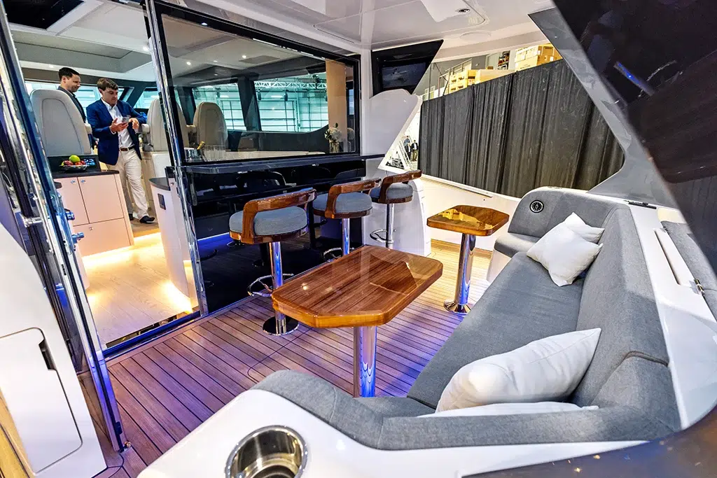 Designed with multiple engaging areas, the 670 LXS is perfect for hosting gatherings and enjoying leisure time on the water. The expansive cockpit, complemented by deployable beach doors, creates a spacious environment for socializing, while state-of-the-art entertainment systems ensure an enjoyable experience for all guests.