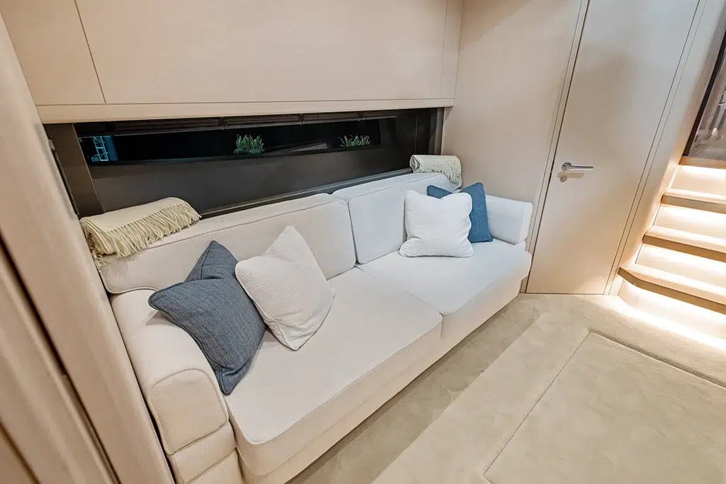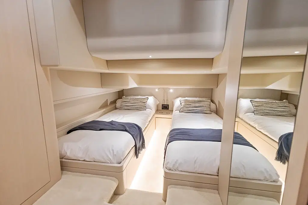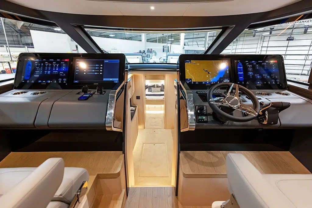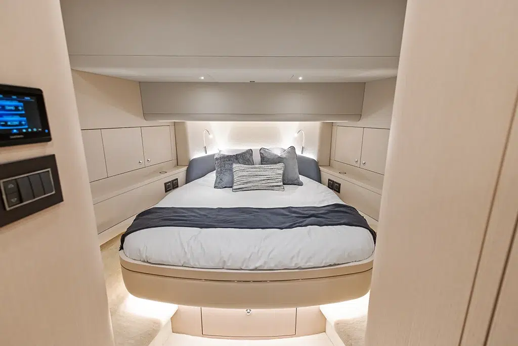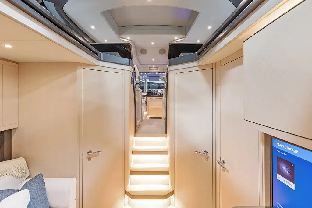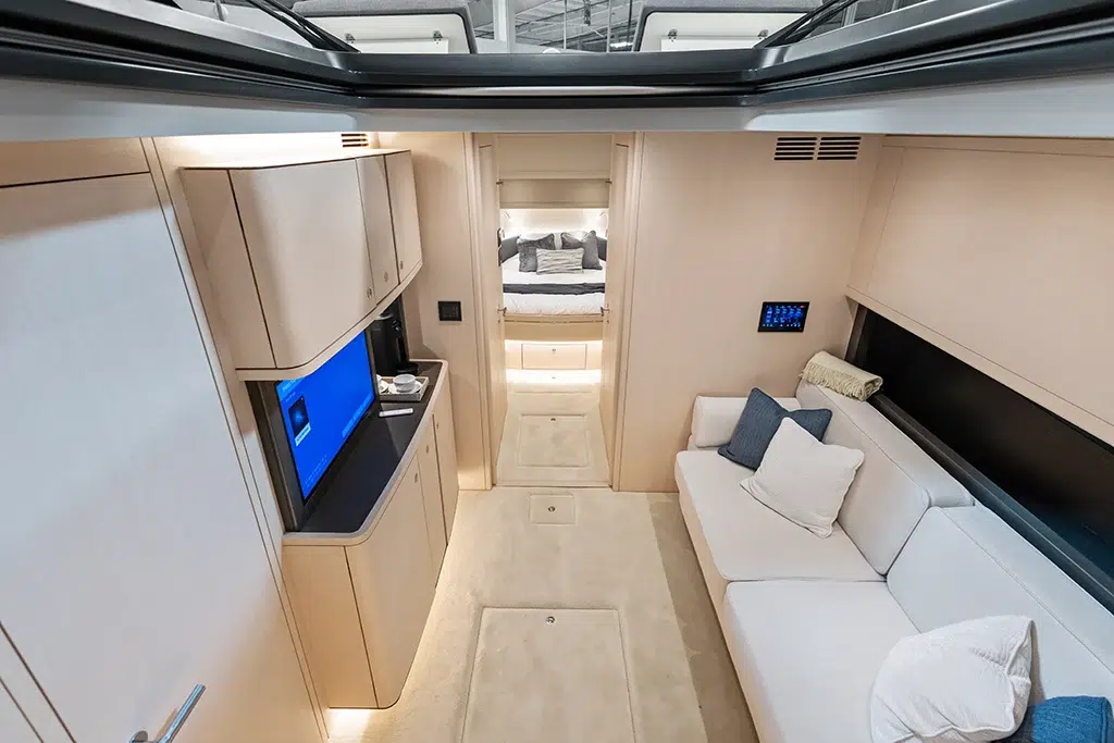 Spanning 66 feet 9 inches in length and boasting a beam of 16 feet 2 inches (expanding to 19 feet 6 inches with cockpit beach doors deployed), the 670 LXS offers ample space for relaxation and entertainment. The yacht features three lavish staterooms, providing comfortable accommodations for extended voyages. The interior is available in three sophisticated color options—Salt (Light), Coral (Medium), and Neptune (Dark)—allowing owners to personalize their living spaces.