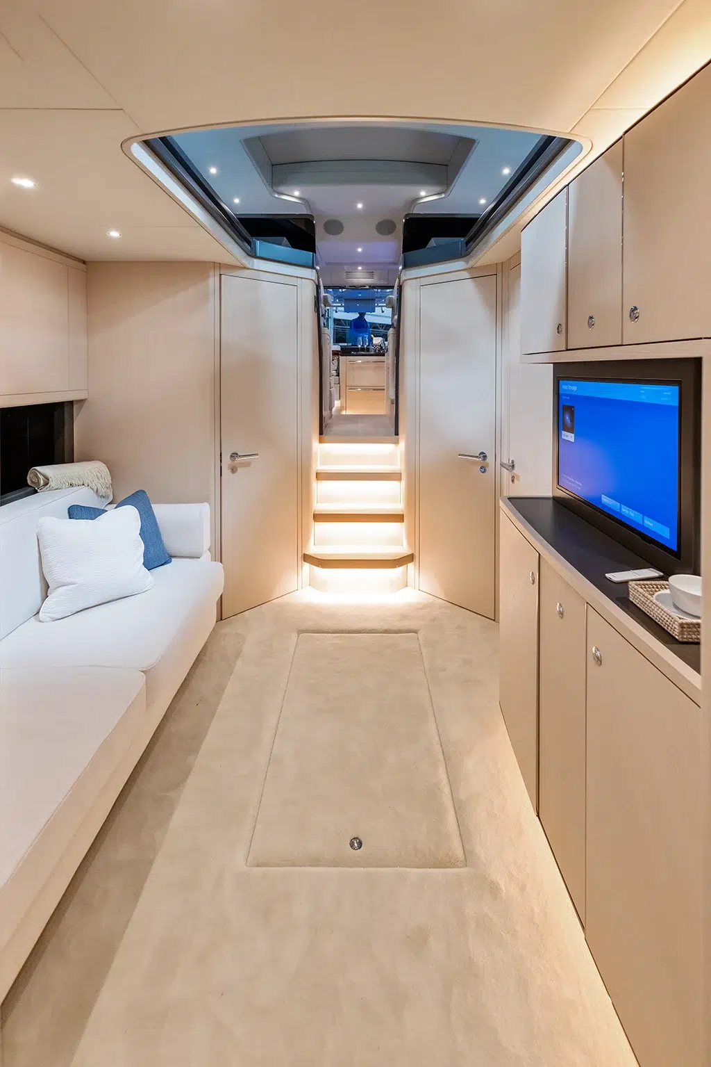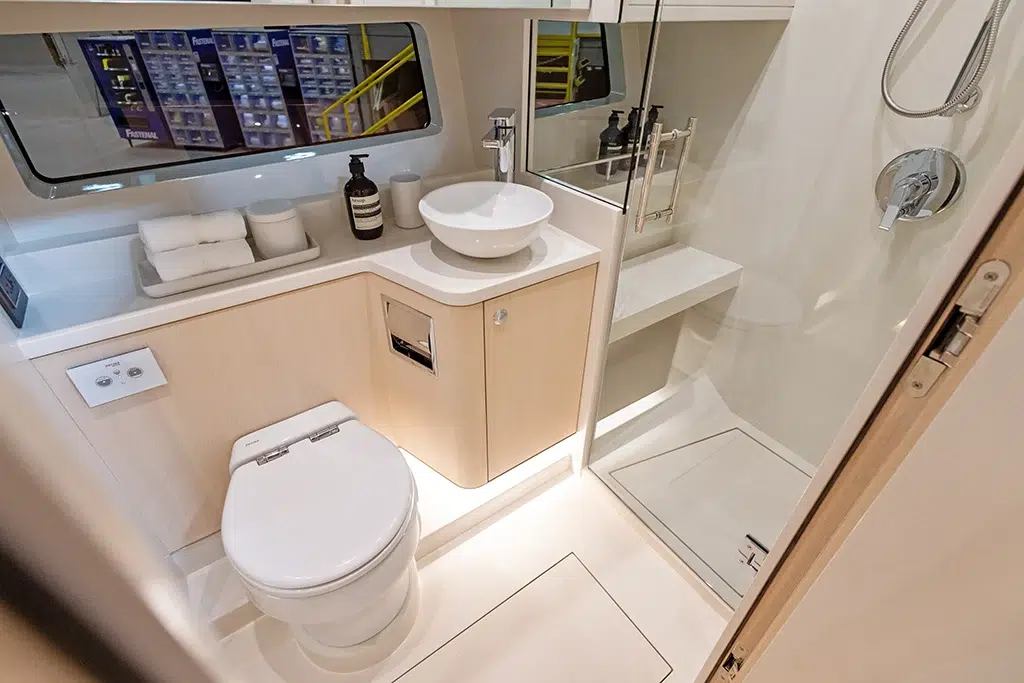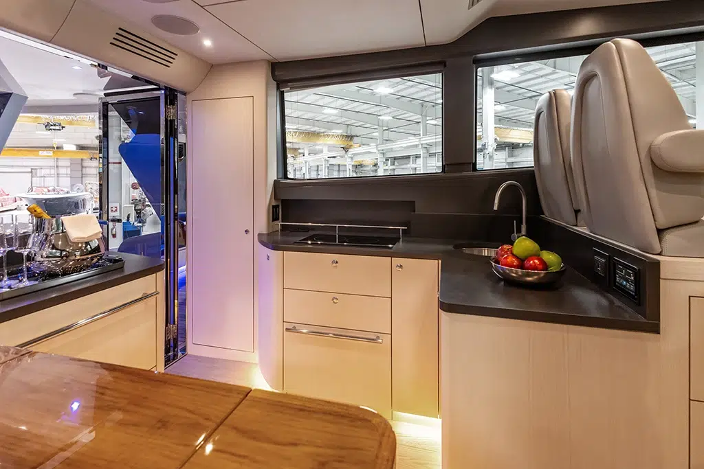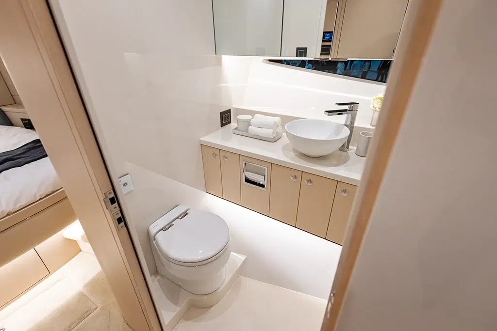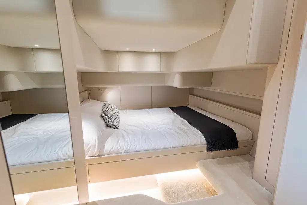 Spanning 66 feet 9 inches in length and boasting a beam of 16 feet 2 inches (expanding to 19 feet 6 inches with cockpit beach doors deployed), the 670 LXS offers ample space for relaxation and entertainment. The yacht features three lavish staterooms, providing comfortable accommodations for extended voyages. The interior is available in three sophisticated color options—Salt (Light), Coral (Medium), and Neptune (Dark)—allowing owners to personalize their living spaces.